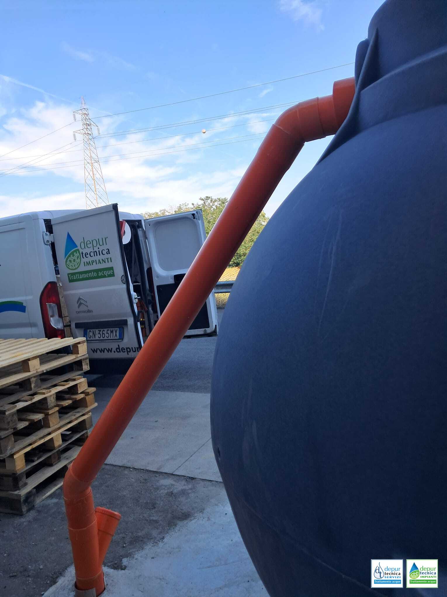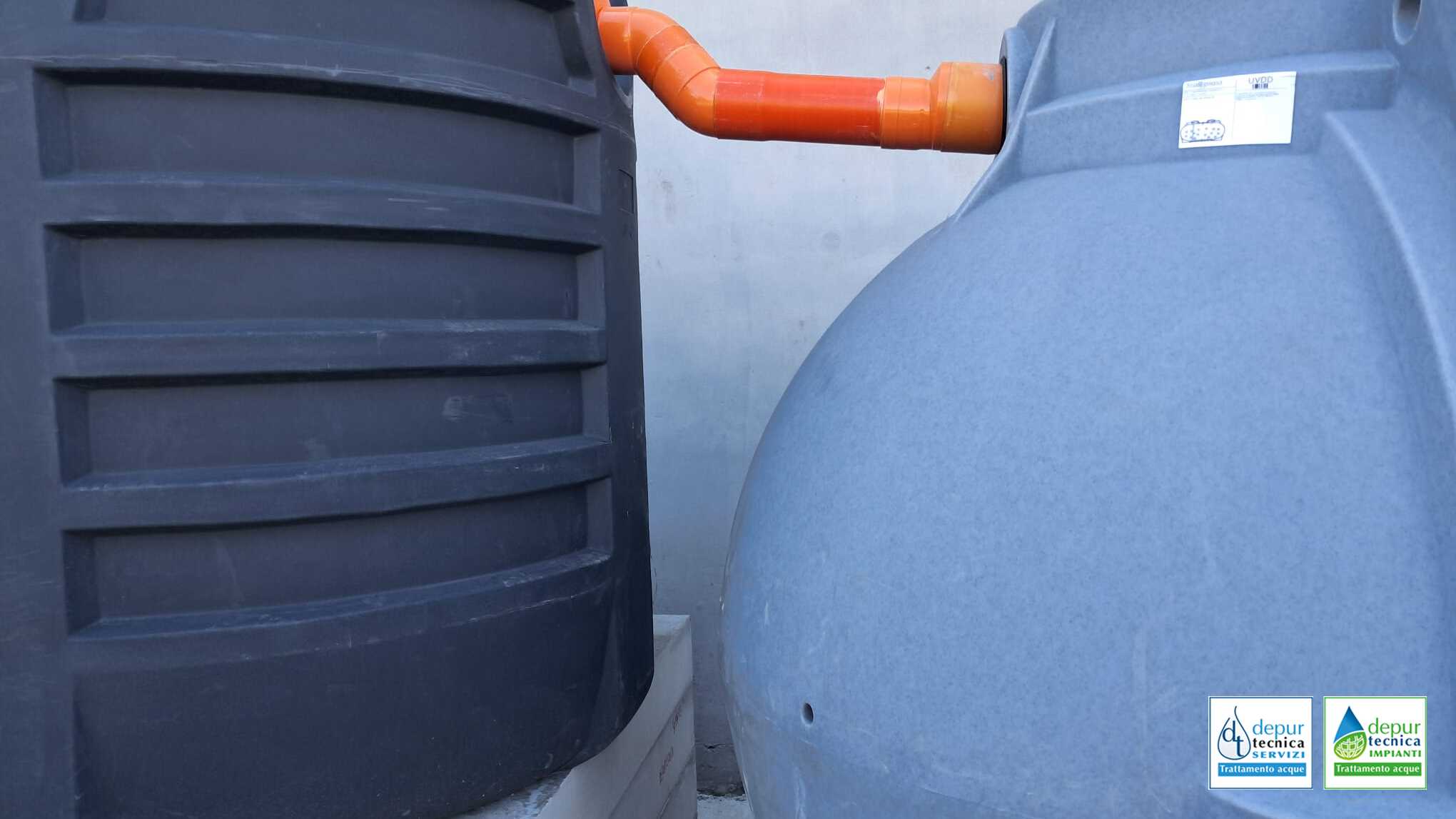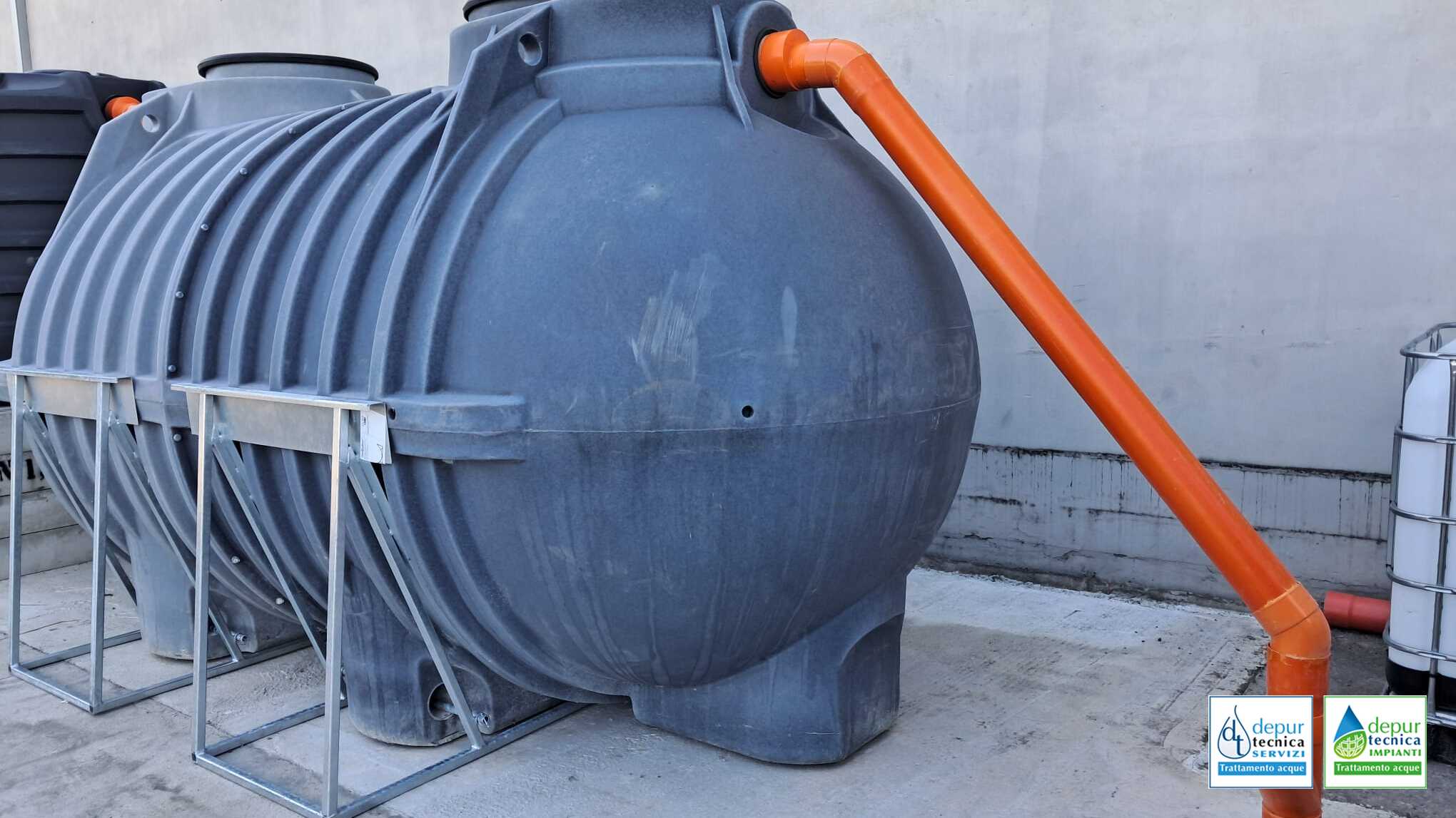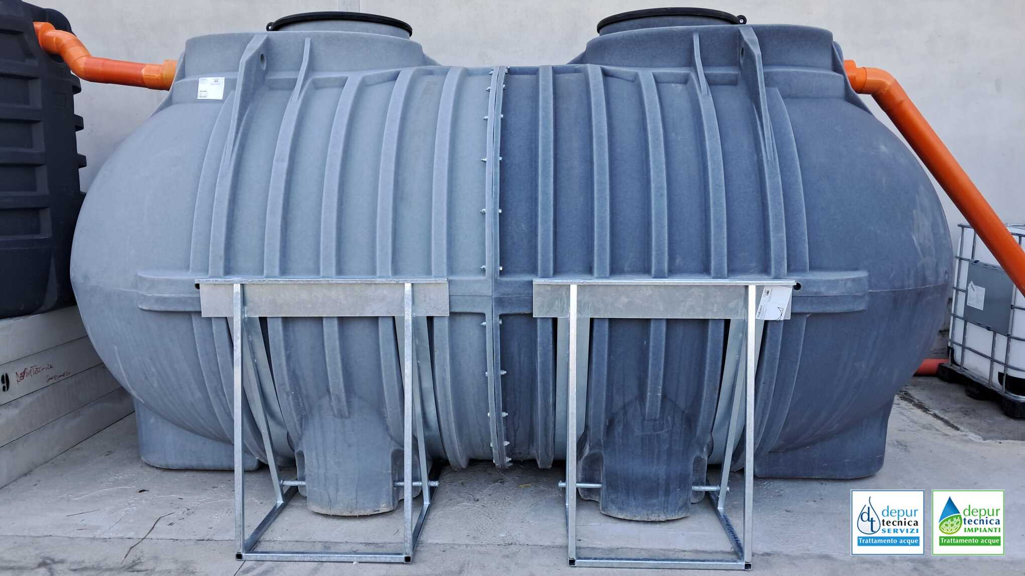 Il dettaglio che fa la differenza: Come si nota dalle tubazioni di raccordo in PVC rigido arancione, l’intero sistema è stato assemblato in superficie. Poiché queste vasche in polietilene nascono strutturalmente per l’interro, Depurtecnica le ha dotate di speciali telai di rinforzo in acciaio zincato.